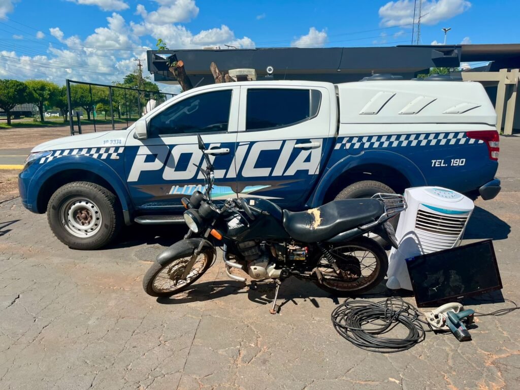 Polícia Militar de Jardim recuperou motocicleta preta furtada e objetos possivelmente roubados após denúncia de agressão a mototaxista e morador, encaminhando tudo à delegacia.