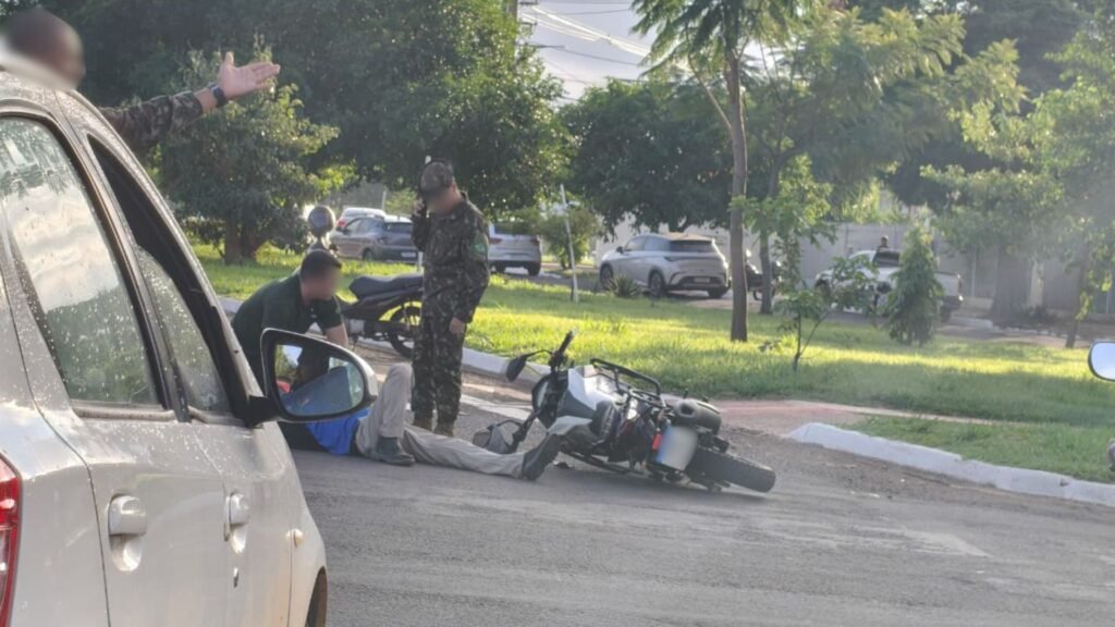 Na manhã desta quinta-feira (9), um acidente ocorreu no cruzamento da Avenida Afonso Pena com a Duque de Caxias, em Campo Grande. A colisão resultou em um motociclista caído, que recebeu assistência de militares que estavam nas proximidades.