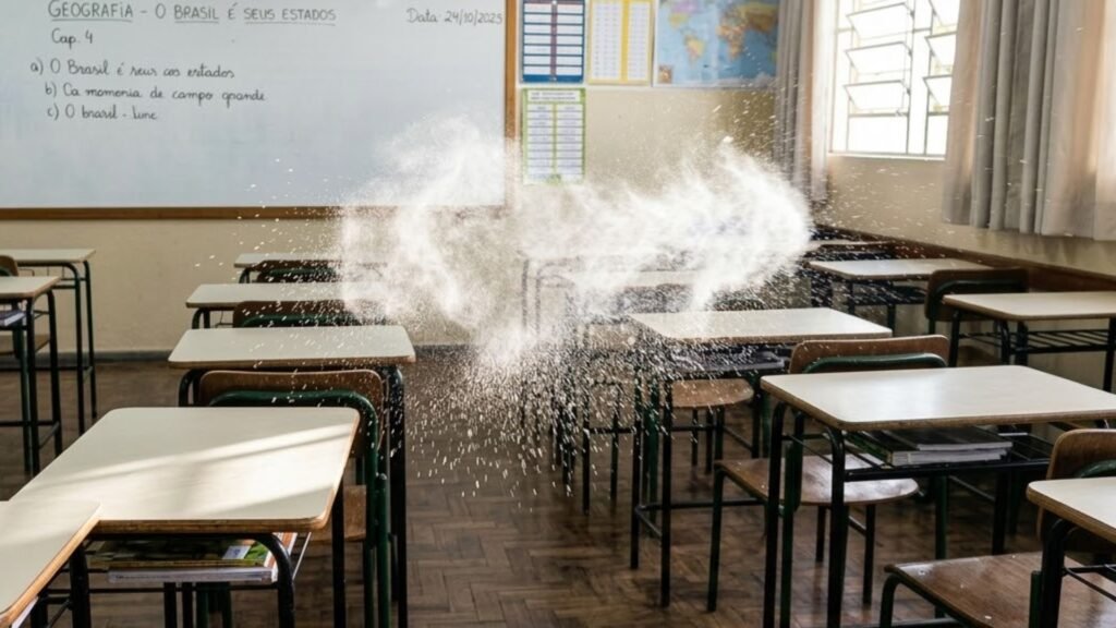 Em decorrência da reação do gás, alguns alunos apresentaram mal-estar e todos foram retirados da sala e encaminhados para o pátio – para ventilação e acompanhamento. Inclusive, um aluno sofreu reação alérgica.