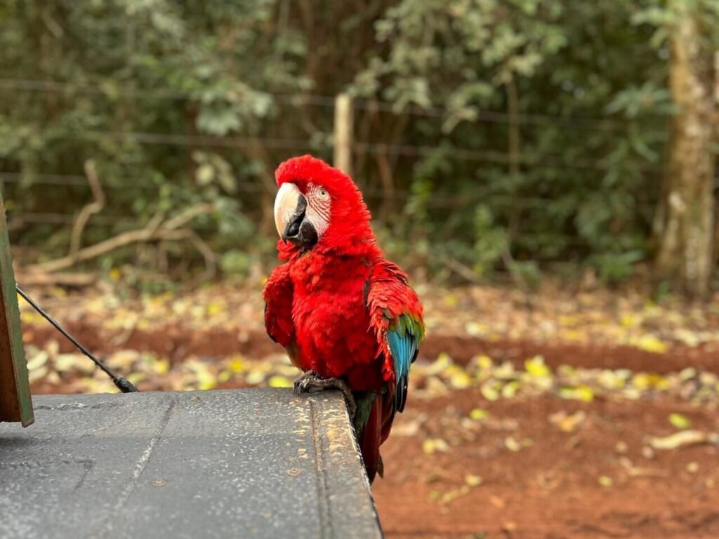 Uma arara-vermelha foi resgatada pela Polícia Militar Ambiental em Dourados, na última segunda-feira (4/8), após um incidente em uma residência. O animal foi encontrado no quintal de uma casa, desorientado.