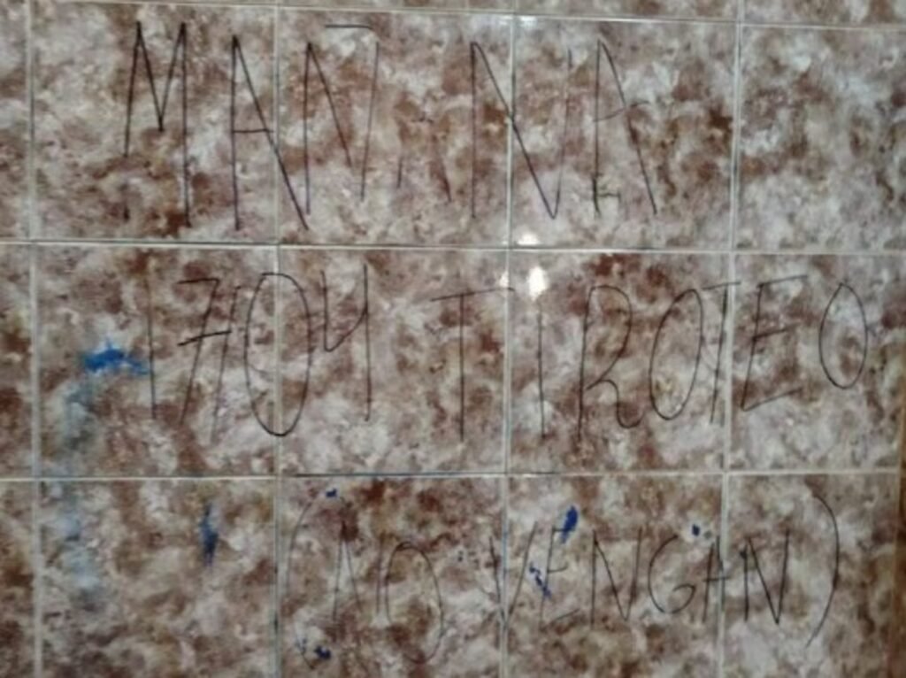 A Polícia Nacional reforçou a segurança no local. Alunos do Centro Educacional Regional Dr. Raúl Peña encontraram a mensagem escrita à mão na parede de azulejos de um dos banheiros da escola, alertando sobre um tiroteio marcado para sexta-feira.