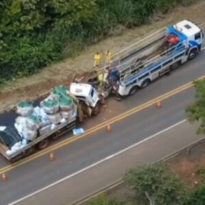 O motorista da carreta tentou desviar, mas colidiu na lateral esquerda do caminhão. O impacto fez a carreta sair da pista e tombar nas margens da rodovia, ficando em meio à vegetação.