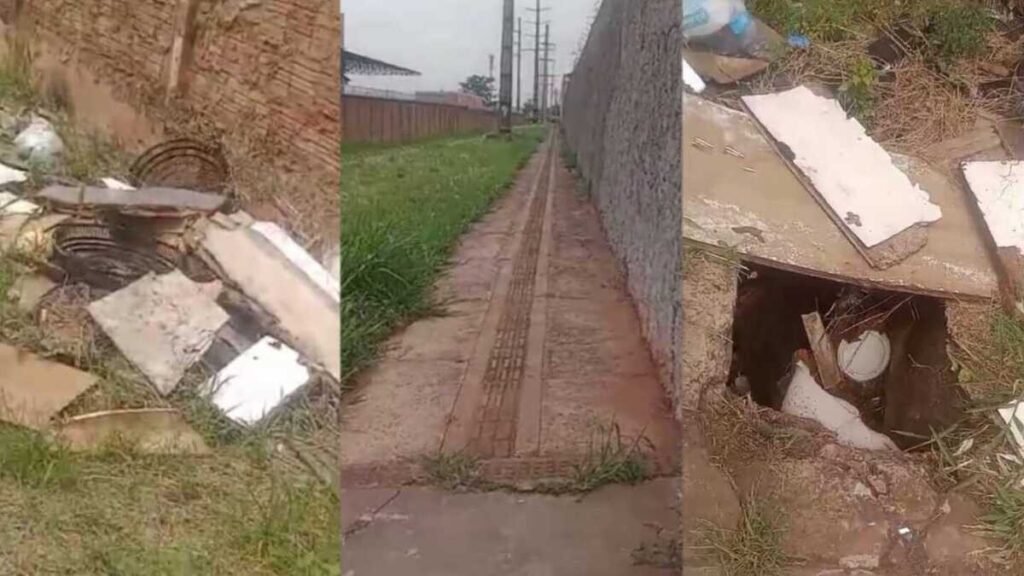 A falta de iluminação e o mato alto agravam a situação, aumentando a sensação de insegurança entre os que precisam passar por ali diariamente. Os bueiros sem tampa representam um risco físico, especialmente à noite.