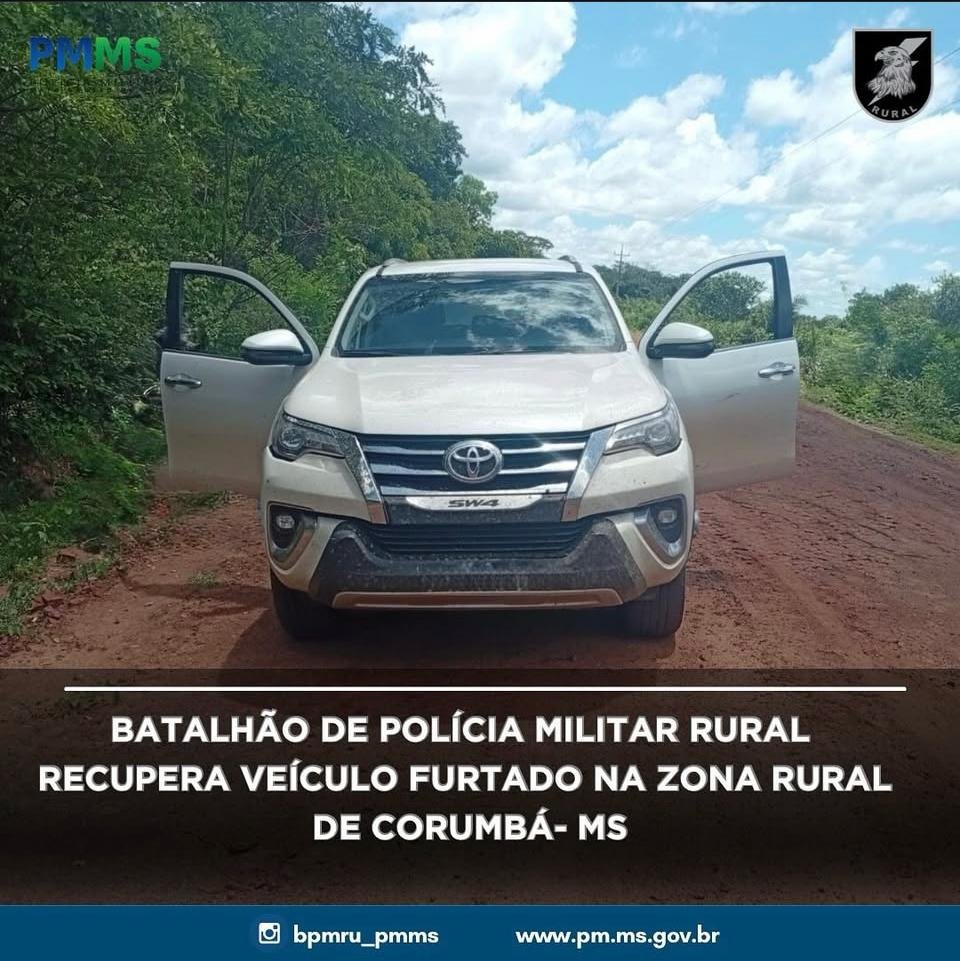 A equipe do Batalhão de Polícia Militar Rural recuperou, nesta sexta-feira, uma Toyota Hilux SW4 furtada e prendeu dois suspeitos durante patrulhamento na zona rural de Corumbá. Após denúncia de que o veículo estaria circulando por estradas vicinais para evitar fiscalização, a equipe intensificou o policiamento e localizou o automóvel na MS-228.