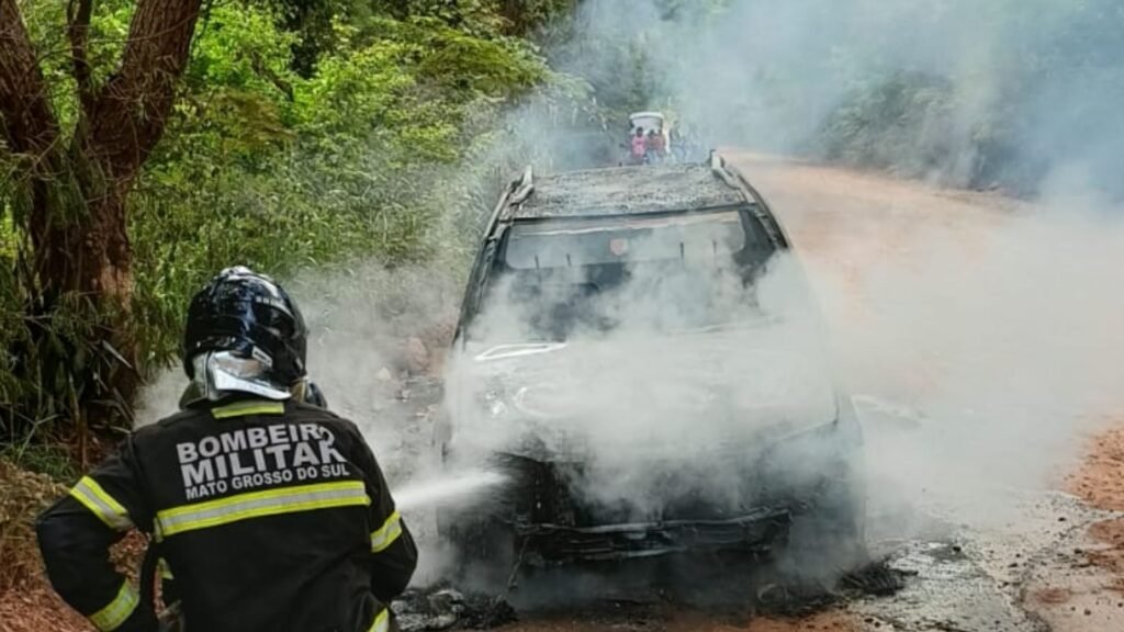 Um carro ficou completamente destruído durante um incêndio registrado em Ladário, município distante aproximadamente 420 quilômetros de Campo Grande.