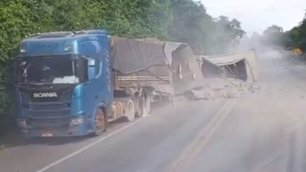 A carroceria de uma carreta bitrem carregada de cimentos tombou na manhã desta quarta-feira (20), na BR-262, sentido Aquidauana a Miranda. A carga ficou espalhada na pista.