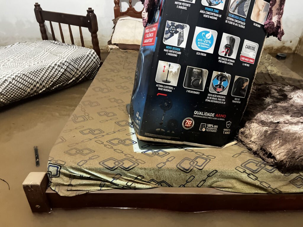 Moradores relatam casas com água até a janela e perda total de móveis, eletrodomésticos e alimentos plantados. José Alício, que mora em um imóvel acima do nível do rio, ajuda vizinhos com viagens de barco para resgate de pessoas e pertences.