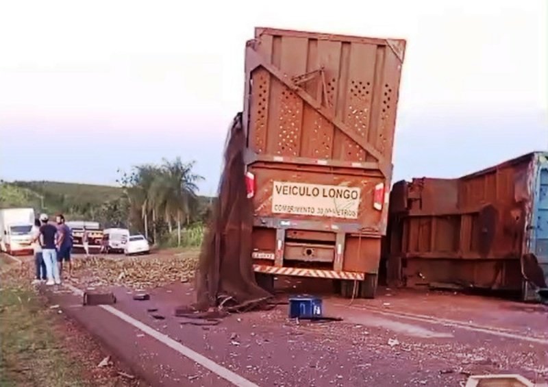 Segundo informações, o acidente teve início após duas carretas colidirem lateralmente enquanto trafegavam no mesmo sentido. O impacto resultou no envolvimento dos outros veículos, com uma das caminhonetes ficando prensada sob a carga de cana-de-açúcar de uma das carretas.