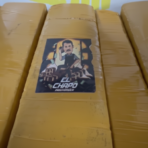 Os tabletes da droga apreendida estavam adesivados com caricaturas do narcotraficante mexicano Joaquín Archivaldo Guzmán Loera, conhecido como ‘El Chapo’. Ele é acusado de ser o chefe do Cartel de Sinaloa, considerado uma das organizações criminosas mais poderosas e violentas do mundo.