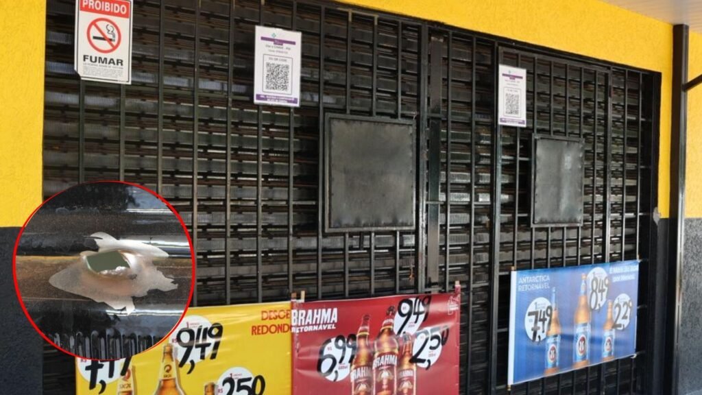Os tiros deixaram diversas marcas visíveis, confirmando a intensidade da ação. A conveniência está fechada para avaliação das equipes responsáveis pelo caso.