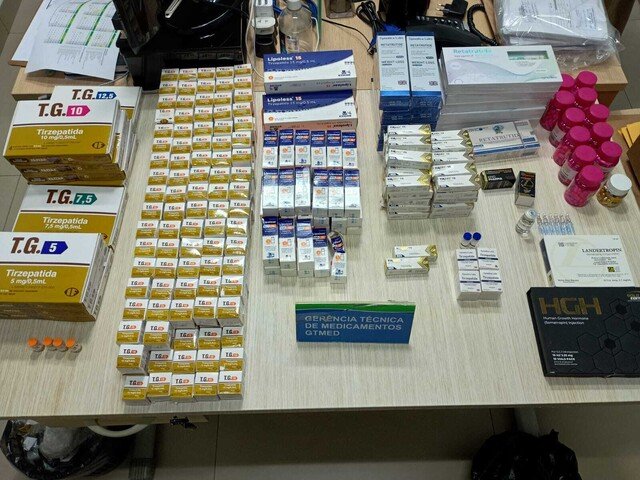 Entre os itens apreendidos estão ampolas de tirzepatida, canetas de retratutida, semaglutida, somatropina, esteroides anabolizantes, toxina botulínica, oxandrolona, lisdexanfetamina e suplementos alimentares. Todos os produtos estavam em desacordo com a legislação sanitária brasileira, sem comprovação de registro, origem conhecida ou autorização para transporte e comercialização.