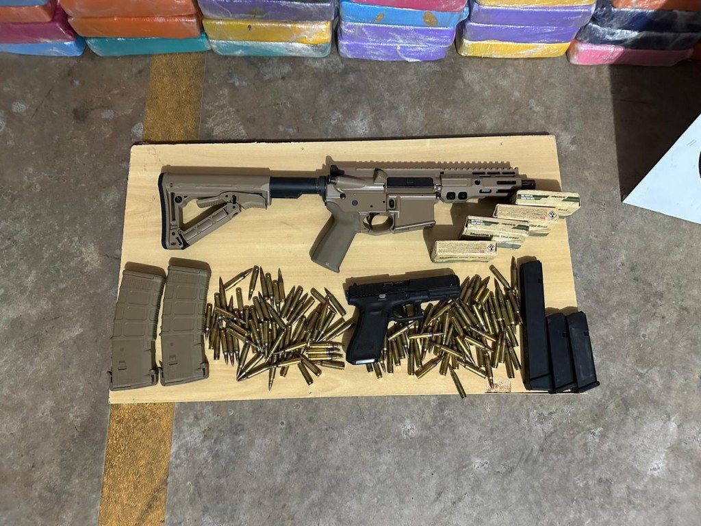 Durante uma fiscalização de rotina, equipes do Tático Ostensivo Rodoviário (TOR) da Polícia Militar abordaram um caminhão-tanque e localizaram aproximadamente 270 quilos de cocaína, além de um fuzil Colt calibre 5.56, uma pistola Glock calibre 9 mm, carregadores e 133 munições.
