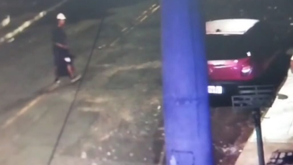 As imagens registradas mostram o momento em que o suspeito se aproxima do veículo. Vestindo bermuda, uma camisa, um boné branco e carregando uma mochila, ele observa a área ao redor do carro antes de se afastar temporariamente. Contudo, logo em seguida, ele retorna e abre a porta do motorista, concretizando o furto.