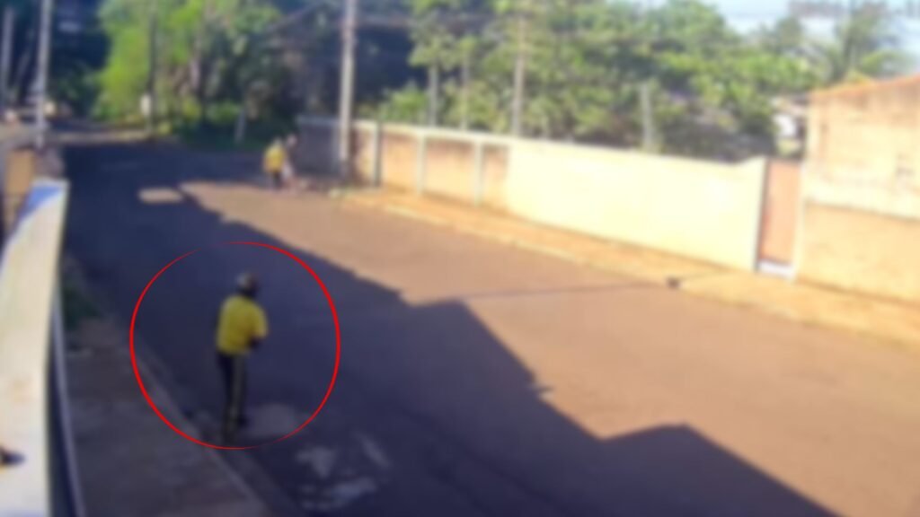Câmera de segurança de uma casa registrou o momento em que a vítima sai da Rua João Nepomuceno e, já ferida, aparece na Rua Barão de Itapetininga pedindo ajuda e mancando.