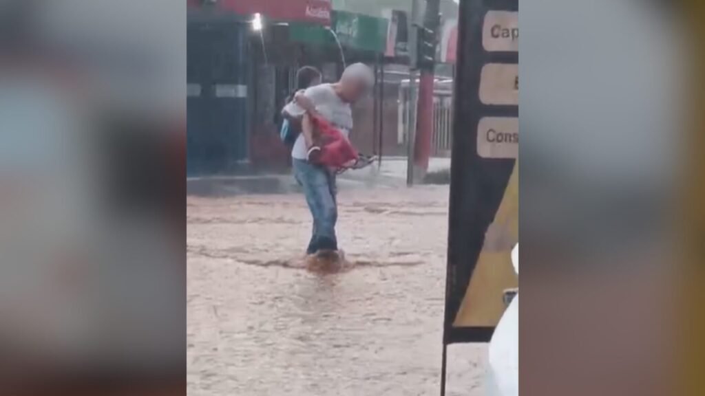 Durante um temporal em Campo Grande, um idoso foi visto ajudando uma criança a atravessar uma enxurrada. O episódio ocorreu por volta das 17h20 na Rua Raquel de Queiroz, no bairro Aero Rancho.