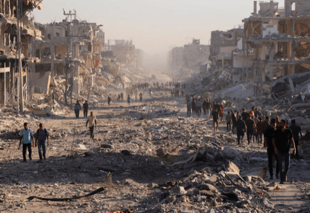 Foto: Palestinos caminham em meio a escombros na Cidade de Gaza | 31/10/2025/Ebr