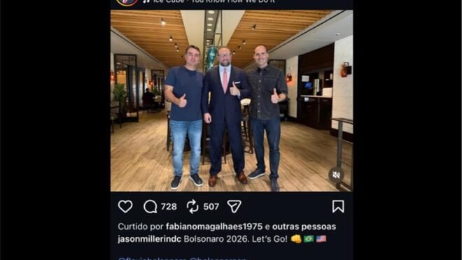 Na postagem, o assessor escreveu: "Bolsonaro 2026. Let's go!", acompanhada de emojis das bandeiras do Brasil e dos EUA. Este apoio já havia sido manifestado por Miller no final do mês passado após um encontro entre ele e Flávio na Conferência de Ação Política Conservadora (CPAC) no Texas.