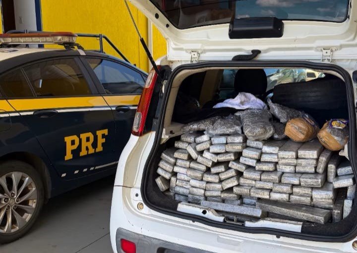 No interior do Fiat Uno, a PRF encontrou 552,40 kg de maconha, 43,70 kg de skank e 2,5 kg de haxixe, totalizando 598,60 kg de drogas.