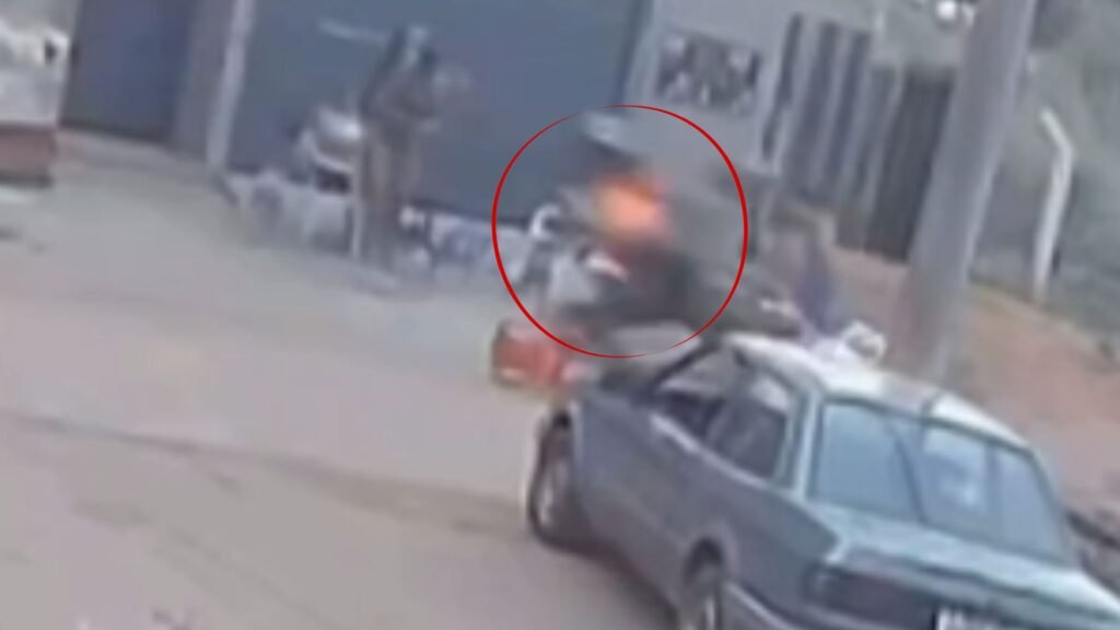 A gravação mostra várias crianças sentadas em frente à residência quando o motociclista aparece em alta velocidade, deixando de realizar uma conversão obrigatória e colidindo com elas. Após o impacto, as crianças caem ao chão.