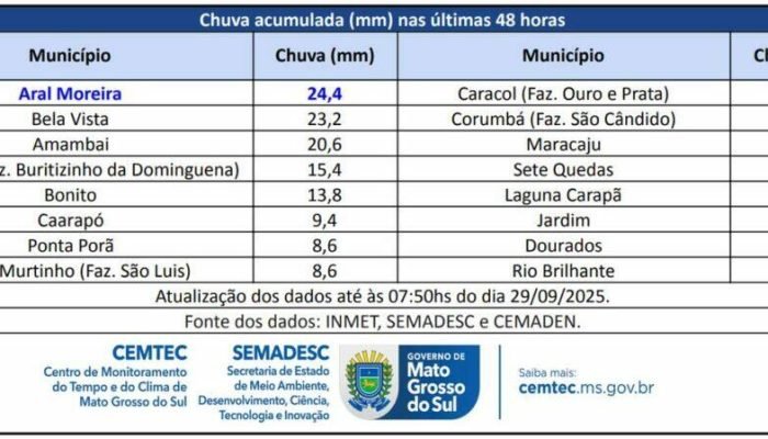 INMET emite alerta de chuvas intensas para Naviraí e região do Conesul de MS