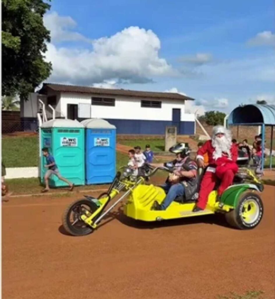 A chegada do Papai Noel em São Gabriel do Oeste, a 168 km de Campo Grande, marcou a programação do Luzes do Cerrado e trouxe alegria para crianças e famílias no Estádio Municipal. O bom velhinho surpreendeu ao chegar pilotando um triciclo, chamando atenção e arrancando sorrisos de quem aguardava ansioso pelo momento especial. A tarde foi dedicada ao público infantil, com brinquedos infláveis e distribuição de doces.