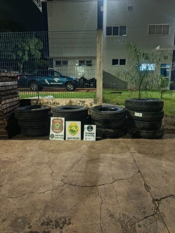 Próximo dali, um veículo com placas do Paraguai já estava preparado e carregado com outros cinco pneus, evidenciando a intenção de transportar a mercadoria ilícita para o interior do Brasil.