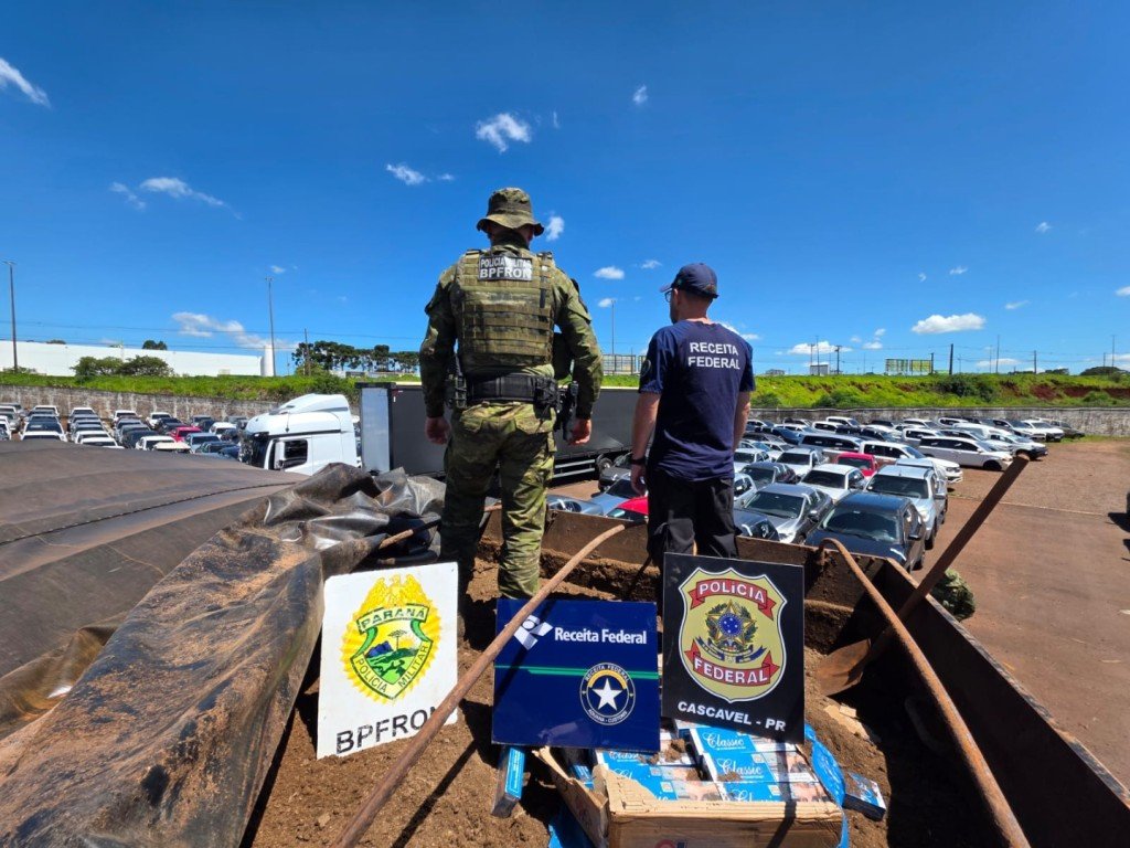 A Polícia Federal, em conjunto com a Receita Federal, o Batalhão de Polícia de Fronteira e o Batalhão de Polícia Militar de Operações Aéreas do Paraná, apreenderam um caminhão carregado com cigarros estrangeiros. A ação ocorreu durante fiscalização na BR-163, no trecho entre os municípios de Santa Teresa do Oeste e Lindoeste/PR. O caminhão foi abordado e os policiais localizaram aproximadamente 600 caixas de cigarros nas caçambas do veículo misturadas a uma carga de esterco.