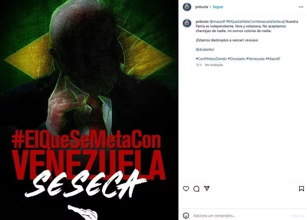 A Polícia Nacional Bolivariana da Venezuela publicou uma foto com a bandeira do Brasil a qual aparece a mensagem: “Quem se mete com a Venezuela se dá mal”. A postagem foi feita em uma rede social, nesta quinta-feira (31).