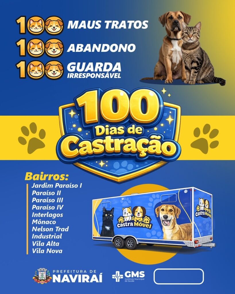 A Prefeitura de Navirai lançará, no mês de abril, a campanha “100 Abandono, 100 Maus-Tratos, 100 Guarda Irresponsável de cães e gatos”, uma grande mobilização voltada ao controle populacional de animais e à promoção do bem-estar animal no município.