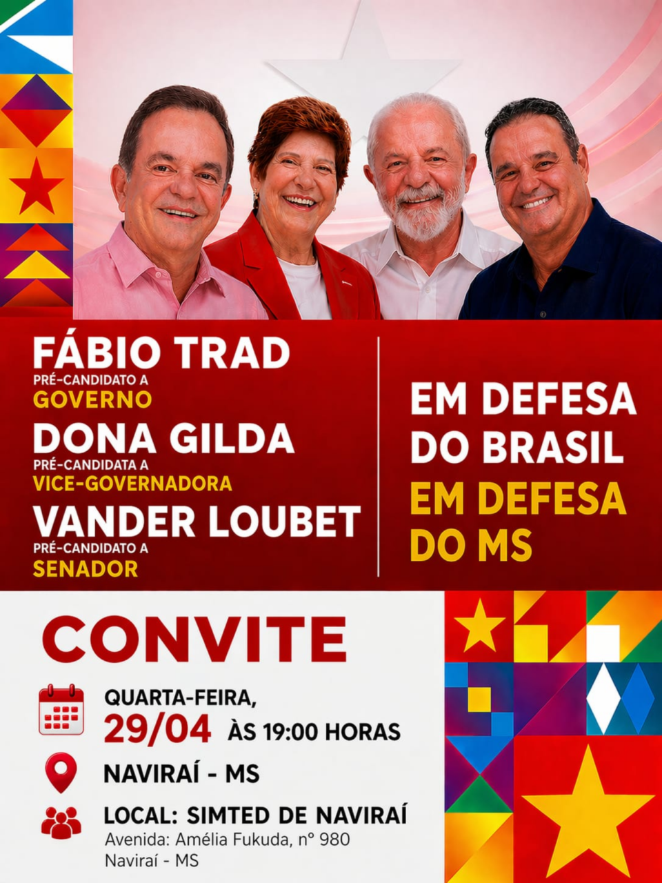O material de divulgação destaca as presenças de Fábio Trad, pré-candidato ao Governo do Estado, Dona Gilda, pré-candidata a vice-governadora, e Vander Loubet, pré-candidato ao Senado. A mensagem central do convite é “Em defesa do Brasil, em defesa do MS”.