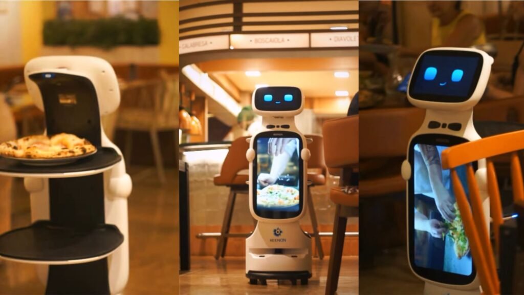A tela integrada na “barriga” do robô exibe o processo de preparação das pizzas na cozinha, além de um mapa do local. Giuseppe também interage com os clientes, falando e até cantando parabéns, enquanto os garçons continuam atuando normalmente.