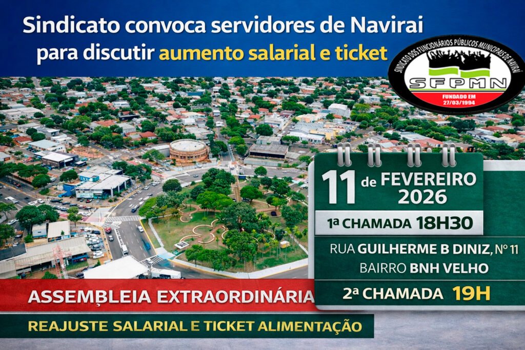O Sindicato dos Funcionários Públicos Municipais de Naviraí (SFPMN) convocou todos os servidores públicos do município, sindicalizados e não sindicalizados, para participarem de uma Assembleia Geral Extraordinária que irá discutir a proposta de reajuste salarial linear e o aumento do ticket alimentação para o ano de 2026.